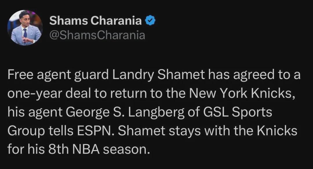 Shams:自由球员兰德里-沙梅特同意以一年合同重返尼克斯。紧接着队记Bondy补充报道,沙梅特签下的是一份无保障合同。